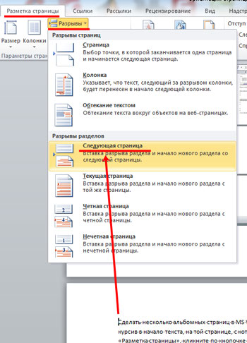 Затем нам нужно сделать разрыв раздела в начале и конце альбомной страницы. Ставим курсор на альбомную, идем на вкладку «Разметка страницы», затем «Разрывы» и выбираем «Следующая страница». Проделайте тоже самое и с последней страницей.