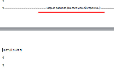 Теперь поставьте курсив на начало той страницы, с которой опять начнутся листы с книжной ориентацией, и повторите все действия. При включенных непечатаемых символах, будет отображаться надпись «Разрыв раздела (со следующей страницы)»