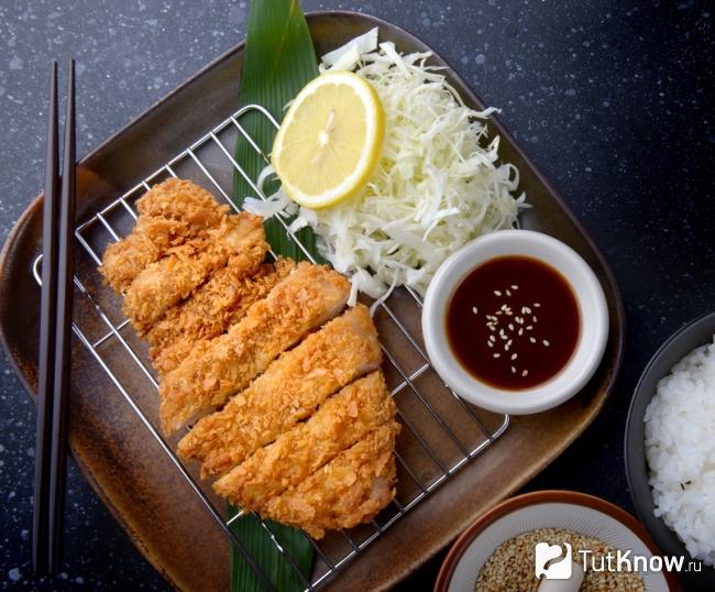Таким странным словом называется в Японии жареная свинина. Блюдо похоже на отбивные по-нашему, только они немного толще и подаются со специальным острым соусом. А в качестве обычных панировочных сухарей там используют крошку из любого хлеба.