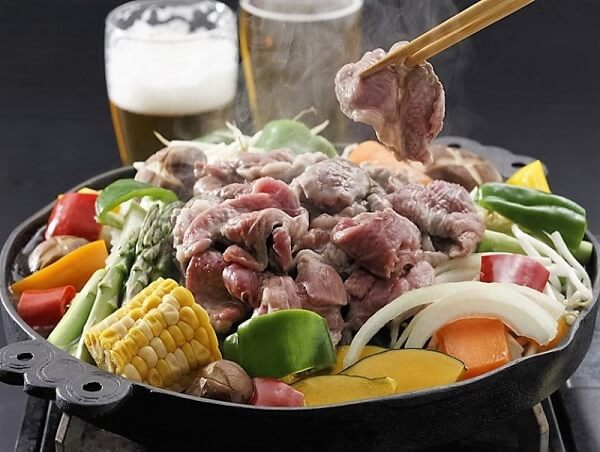 Это местное блюдо из Хоккайдо и префектуры Иватэ. Джингисукан — это мясо и овощи, приготовленные в специальной кастрюле, у которой центральная часть приподнята. Мясо готовится в центральной части кастрюли, позволяя сокам из мяса стекать и впитываться в овощи, расположенные по бокам. Учтите, что у баранины очень отчетливый запах, поэтому блюдо может вам не понравиться.