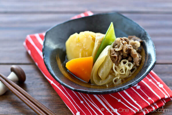 Это один из примеров традиционной японской домашней кухни, где картофель и мясо варят в соевом и сахарном соусе. Иногда в блюдо также добавляют морковь и ширатаки (лапша из конняку). Это типичное блюдо можно найти как в ресторанах izakaya, так и в обычных ресторанах.