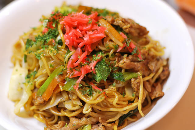 Соус Якисоба представляет из себя блюдо из жареной лапши, свинины, капусты, ростков фасоли и других ингредиентов, заправленных вустерским соусом. Соус Якисоба обычно украшают красным маринованным имбирем, и посыпают зелеными сушеными водорослями. Найти соус Якисоба можно в ларьках или в ресторанах okonomiyaki, а также в магазинах.