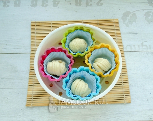 теста на 6 частей, лучше взвесьте на весах. Сформуйте круглые булочки и уложите на смазанную маслом навесную пароварку. Можно подстелить кулинарный пергамент, но я делала без него.