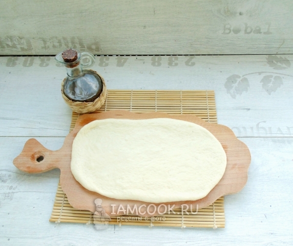Разделите тесто на 2 части и, выложив на смазанную растительным маслом рабочую поверхность, раскатайте в форме прямоугольника. Поверхность прямоугольника также смажьте маслом. Можно использовать любое масло на ваш вкус. Популярные варианты — оливковое масло, кунжутное или сливочное.