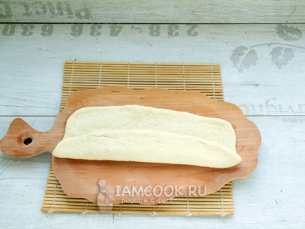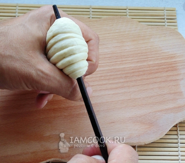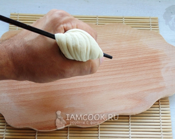 Подготовленное тесто поместите на палочку. Центр кусочка теста на палочке, концы свободно свисают с неё.