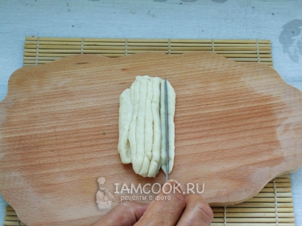 Прижмите тесто и разровняйте по столу. Нарежьте на полоски шириной в 1,5–2 см.