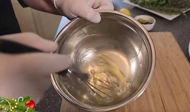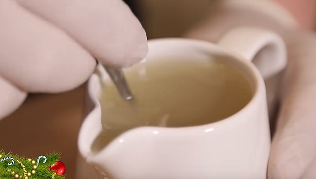 - Соединить оба бульона с желатином и прогреть жидкость, чтобы желатин растаял.
