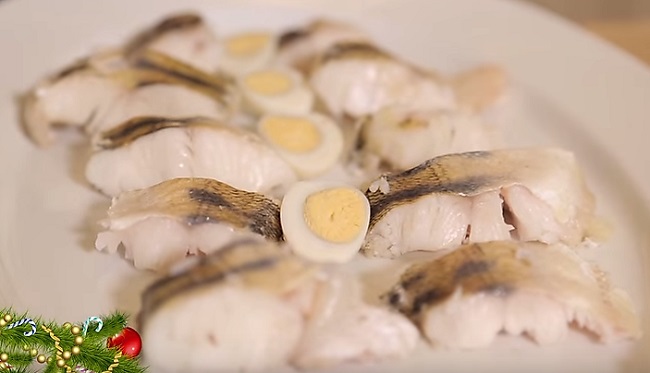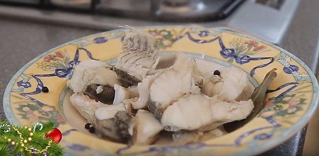- Очищенную рыбу залейте водой на 3 см. от дна кастрюли и варите в течение 49 минут.