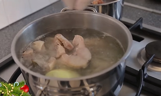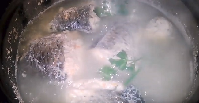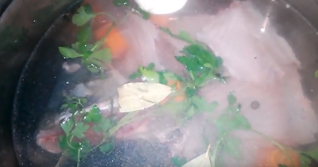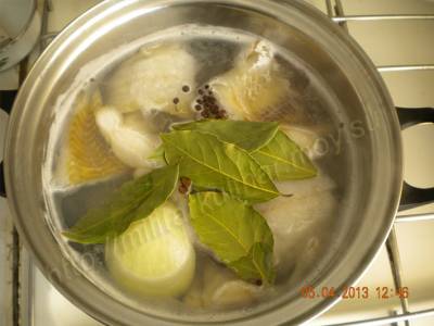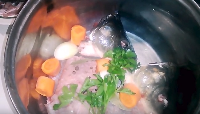 - Сварить бульон из головы и хвоста рыбы. Это займет примерно 1 час.