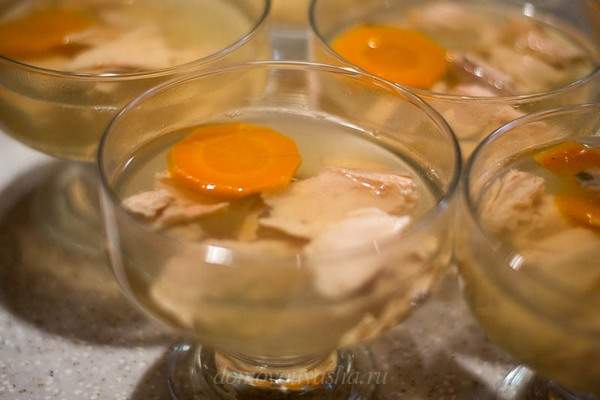 - Достать кусочки филе и дождаться остывания бульона. Затем добавить в него набухший желатин и слегка подогреть, не давая закипеть.