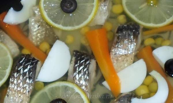 - Залейте красиво уложенные в посуде кусочки рыбы, лука, моркови, зелень бульоном и положите в холодильник застывать.