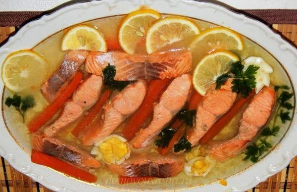 Рыбное заливное делают и без добавления желатина, но застывает оно дольше. Такой рецепт более прост и подходит для тех, кто не любит густую консистенцию. Готовится данное блюдо точно так же, только пропускается момент с добавлением желатина. Лучше всего для такого блюда подойдет красная рыба(хорошо застывают хребты), так как из белой традиционного варианта добиться будет невозможно из – за высокого содержания в ней жира.
