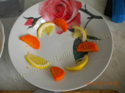 Морковь (которая варилась в «бульоне») режем красиво и также выкладываем на тарелку.